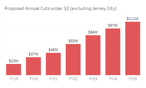 - Jersey City would have $7.5 million cut in 2018-19, followed by cuts of $36 million each year from 2019-20 through 2022-23.