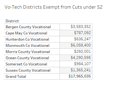 S2 singles-out county vocational school districts for special treatment, allowing these districts to keep their adjustment aid to hold them harmless from any aid cuts.