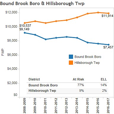 Bound Brook’s student population is 77% at-risk and 14% ELL, while nearby Hillsborough is 9% at-risk and 2% ELL. Bound Brook’s funding per weighted pupil has declined from $9,149 to $7,457 since 2008-09. The weighted funding gap between Bound Brook and Hillsborough is over $4,400 per pupil in 2016-17.