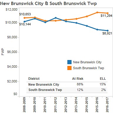 In New Brunswick, nearly 90% of the students are at-risk and 15% are ELL. South Brunswick enrolls 12% at-risk and 2% ELL. From 2008-09 through 2012-13, both districts were funded at a comparable amount per weighted pupil. However, the growth in at-risk students coupled with chronic underfunding in New Brunswick has widened the gap between the districts. New Brunswick is funded at $2,373 less per weighted pupil than South Brunswick in 2016-17.