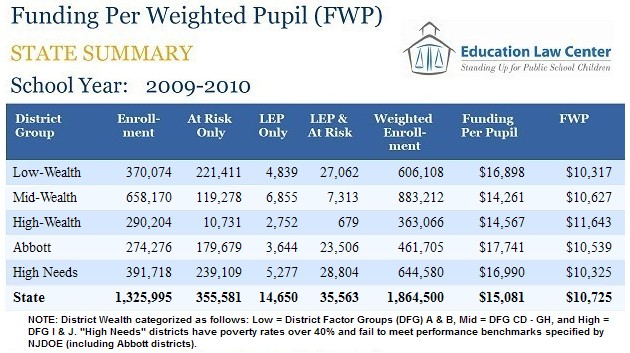 Using each district’s weighted student enrollment under the SFRA, ELC has developed a new, more accurate measure for school spending, called “funding per weighted pupil” or FWP. This measure allows us to fairly compare funding among districts by accounting for the degree to which districts require extra resources to educate students with special needs. For 2009-10, we calculated the FWP for every district and for relevant district groupings: by district factor group (DFG), High Needs, Abbott and the state average. We also include the most salient data elements that go into calculating the district’s FWP: total enrollment, enrollments for at-risk and LEP, weighted enrollment, and state and local funding .